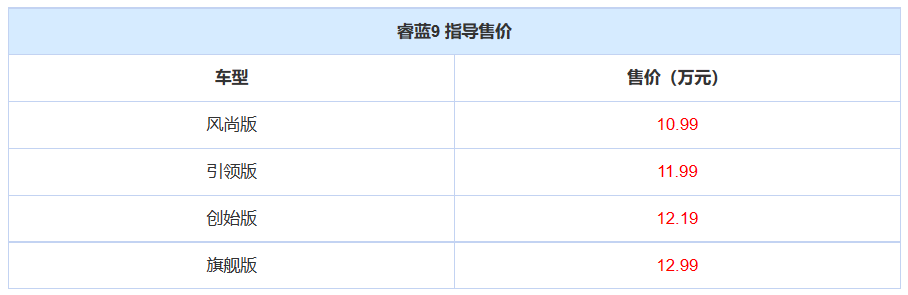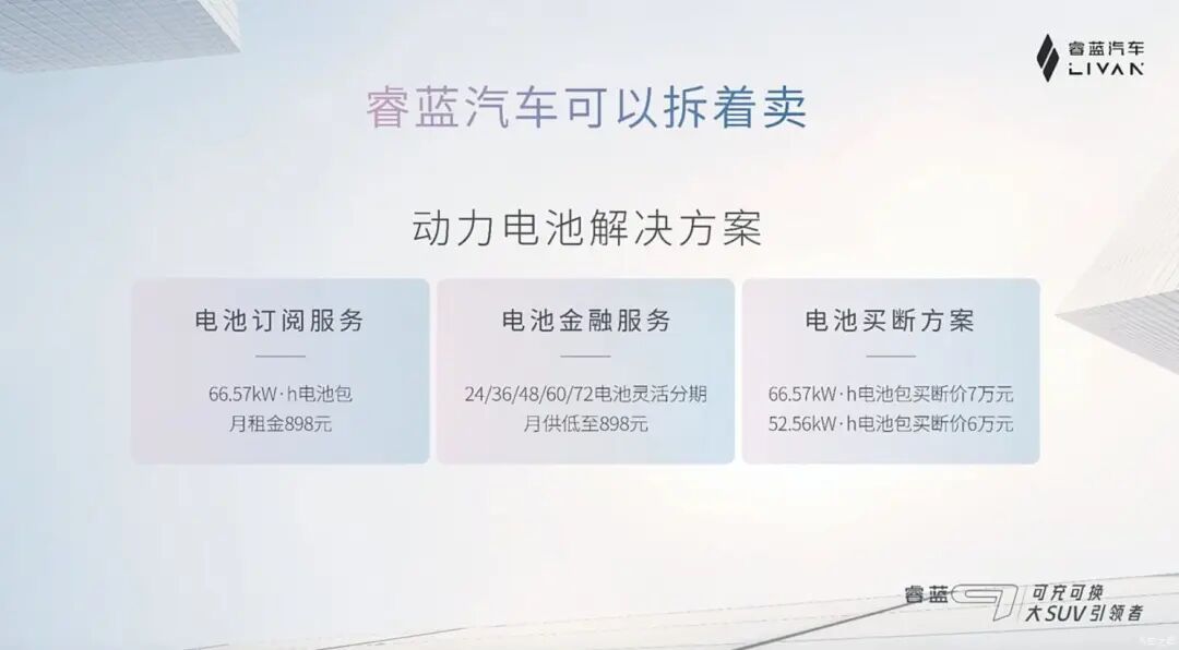 12月17日,睿蓝9正式上市,新车共推出4款配置车型,售价区间为10.99-12.99万元。同时,睿蓝9为用户提供整套动力电池解决方案,其中,包括电池订阅服务:66.57kWh电池包,月租金898元;电池金融服务:电池可以灵活分期,月供低至898元;电池买断方案:66.57kWh电池包买断价7万元,52.56kWh电池包买断价6万元。新车定位中型纯电动SUV,整车造型营造出浓烈的前卫设计感。续航方面,睿蓝9在CLTC工况下续航里程为470公里。