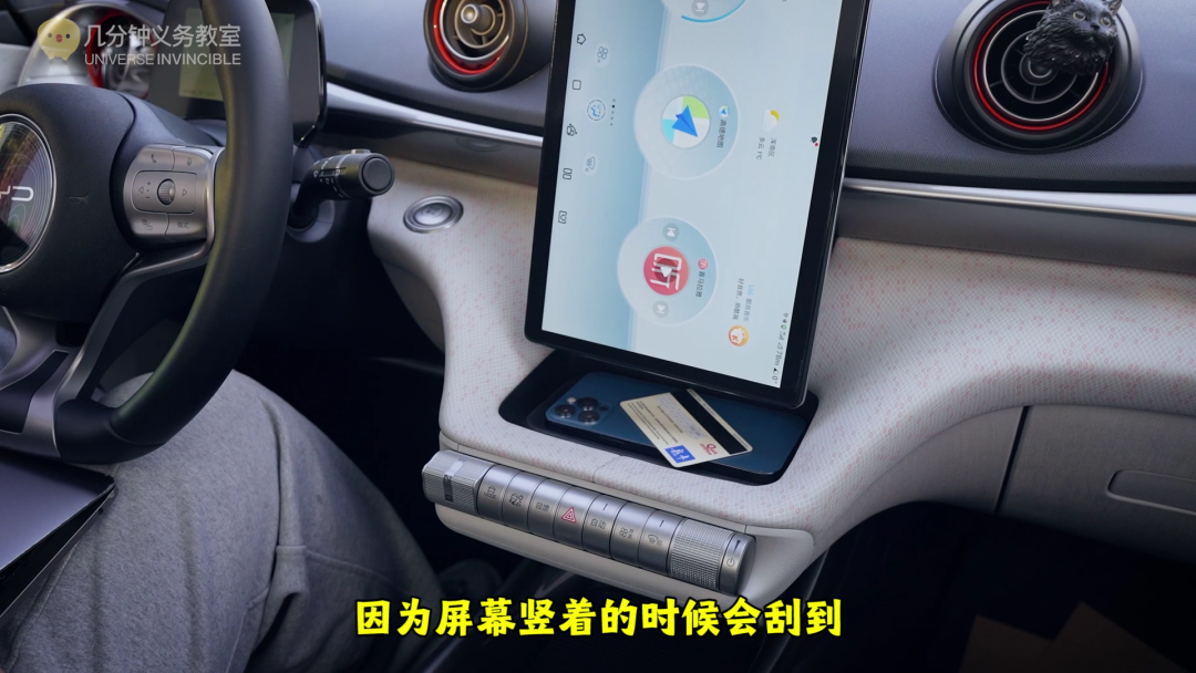 中控区域里面是个储物格,这个位置平时我用来放手机、卡之类的,很方便,但是买车时销售告诉我别放大的东西,因为屏幕竖着的时候会刮到。