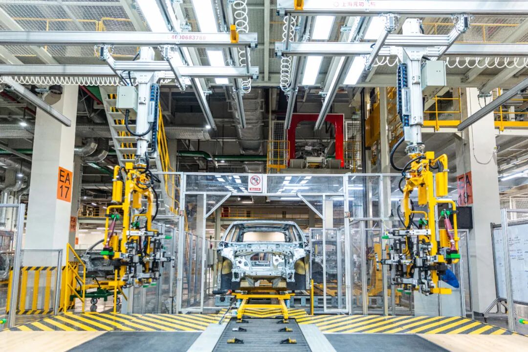 车身车间同样分为两层结构,一楼主要是门盖、底板1和装配线。二楼主要是侧围、底板2、总拼以及报交线。车身车间的设计生产能力是60JPH,即每小时可以完成60台白车身。车间内采用了大量新技术,其中At-line在线测量、EMS空中输送、机器人全自动拧紧工艺、CMT+冷金属过渡焊接工艺均是上汽大众首次使用。车间内拥有机器人数量946台,自动化率高达84%。