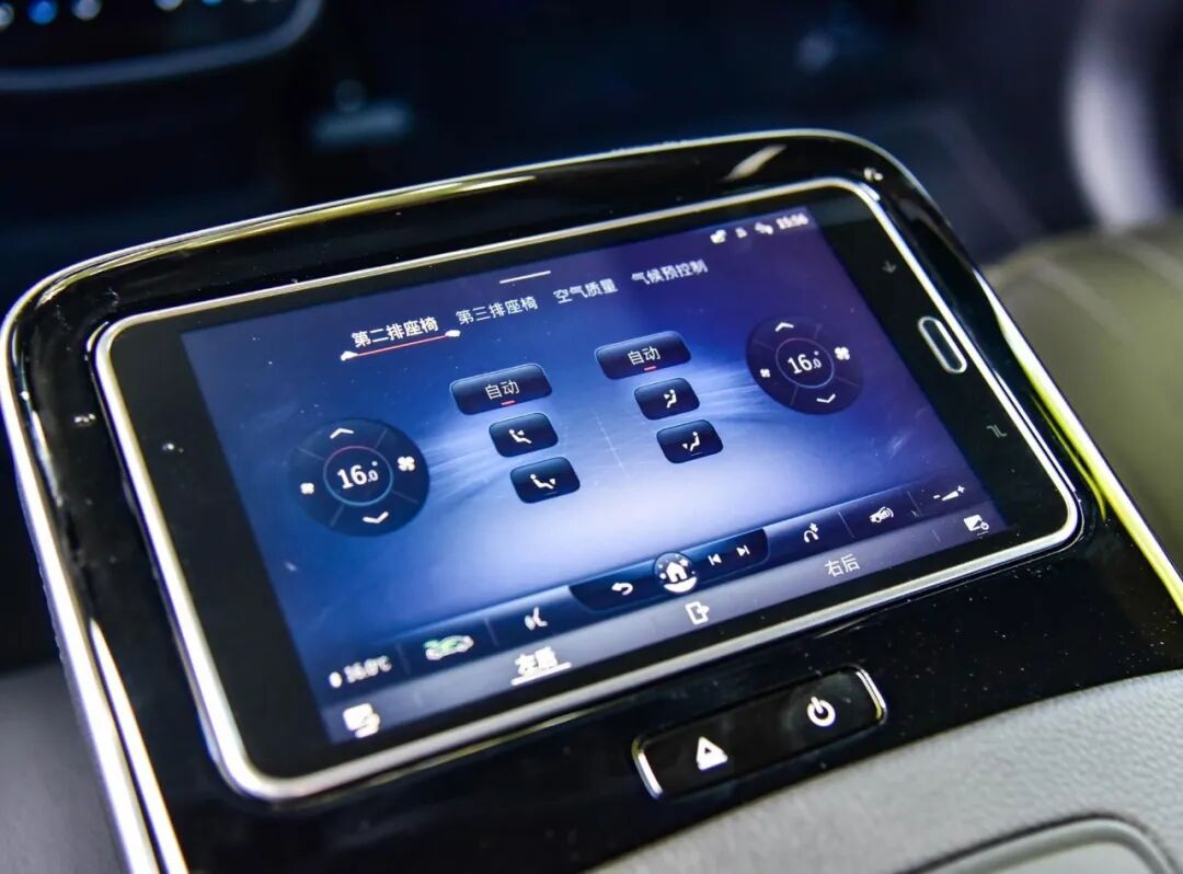 第二排座椅同样可以通过电动方式进行前后调节,靠背和头枕角度也可以单独调整,靠背调整范围约为28°。前后可以移动130mm。并且配有2块11.6英寸触摸屏以及一块平板电脑。