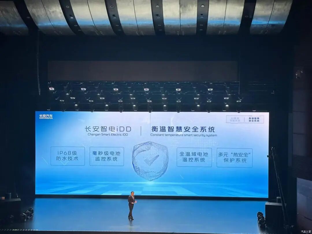 长安智电iDD的衡温智慧安全系统。衡温安全系统通过IP68级防水技术、毫秒级电池监控系统、全温域电池温控系统、多元“热安全”保护系统,这四大电池管理策略,为电动安全出行护航。