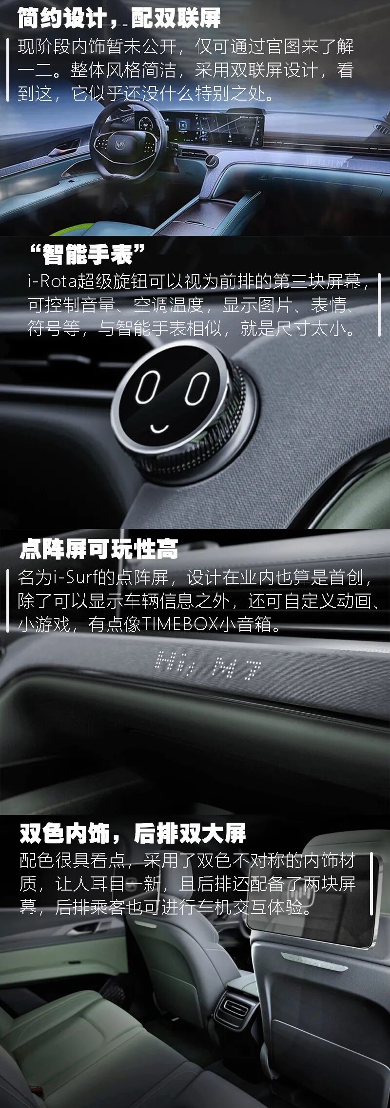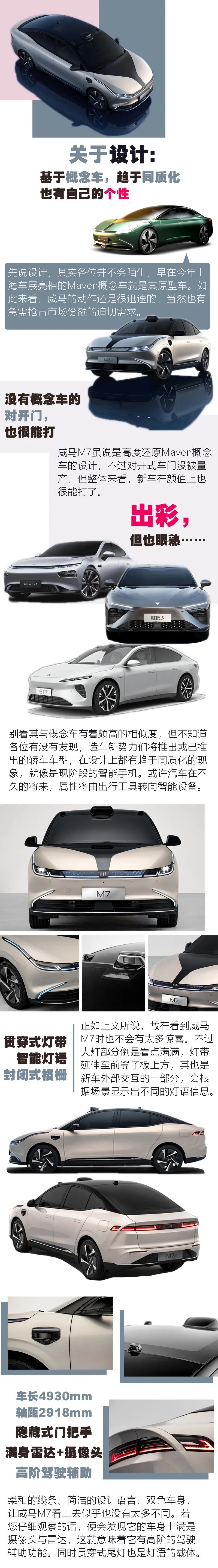 外观设计方面,现阶段造车新势力逐渐趋于同质化,威马M7也是参与者之一,故设计没什么好谈的,就好比高考题难了或是简单了大家都一样,不过威马M7在摄像头和雷达上的武装倒是看点十足,数量之多是很多竞争对手现阶段所不及的。内饰部分,大面来看同样没有亮点可言,细看的话,i-Rota超级旋钮、i-Surf点阵屏、双色不对称材质颇具看点,至于配置目前暂未公布,但差不了,毕竟已经可以视其为威马的旗舰车型了。有关新车的三电信息目前也不多,官方仅表示新车的续航能力将超过700km。