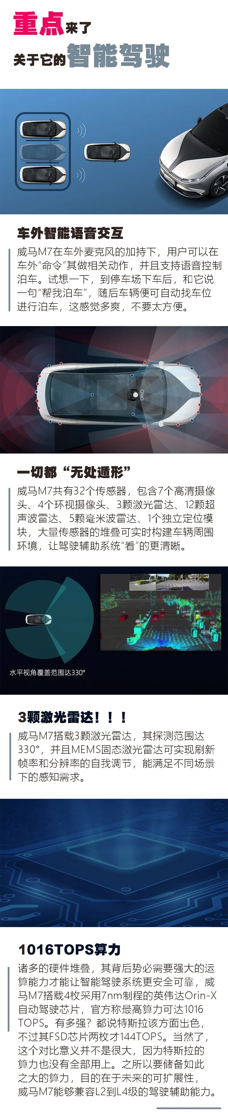 对于威马M7,实际上最让人为之兴奋的还是它展示出的高阶辅助驾驶相关硬件。有一说一,雷达相关硬件的确很牛,至于芯片部分,单纯比算力,从厂家的营销策略来讲,或许会奏效,可吸引用户,但从车辆自身来讲,并不意味着可给用户带来更好的驾驶辅助体验,所以对于威马M7的这一核心卖点,还是需要实际体验才能得出结论。