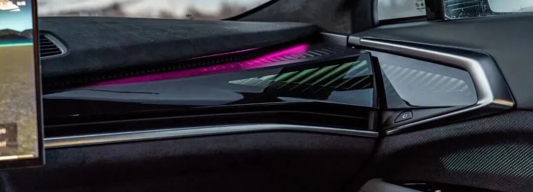 除了常规的氛围灯外,新车门板上的灯带也很有创意,流水式面板氛围灯通过麂皮上的镭雕打孔,呈现出若隐若现的效果,非常漂亮。