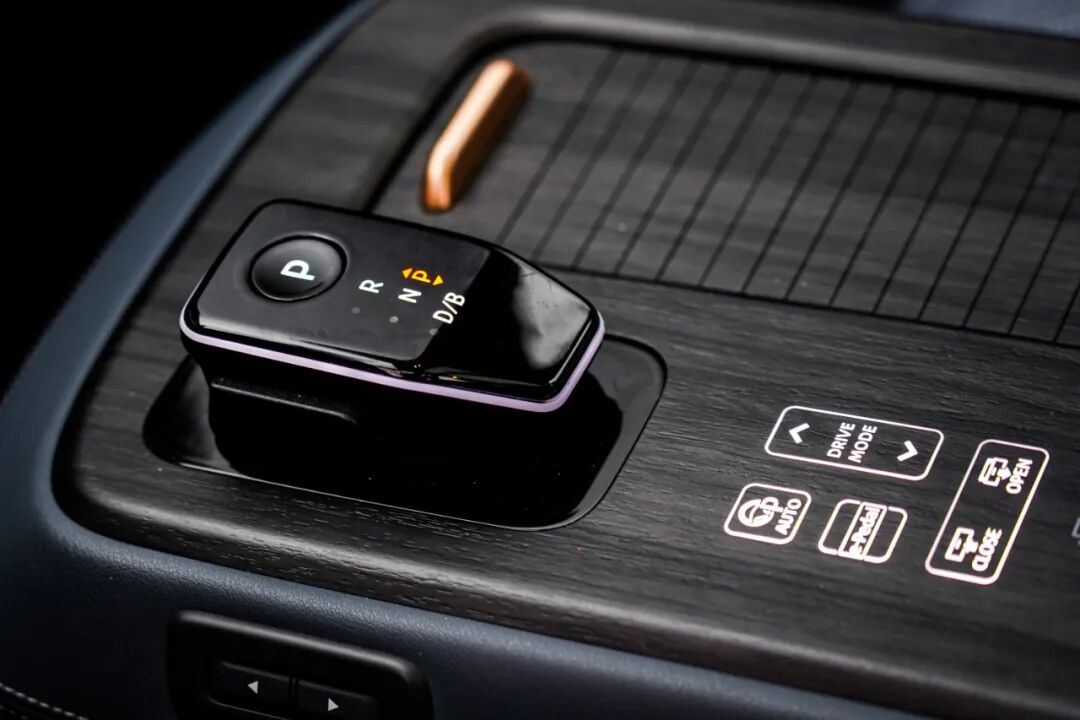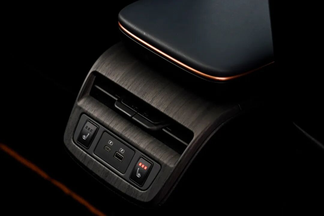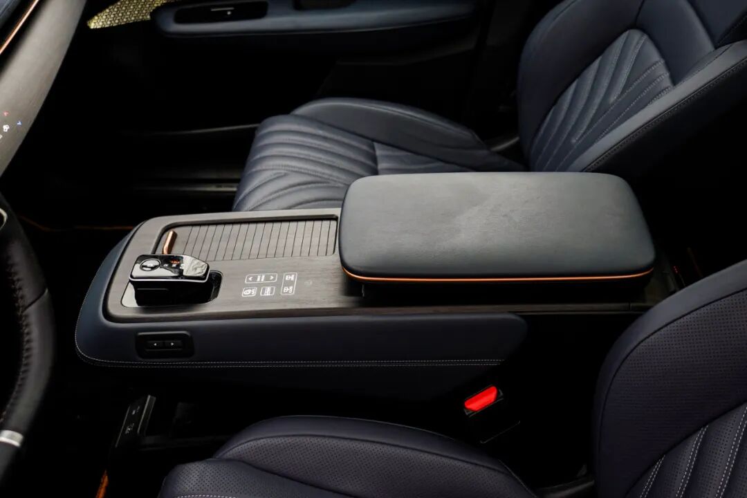 在扶手箱上方,集成了电子挡杆以及驾驶模式切换、单踏板模式切换、储物柜开关的虚拟按键,逼格够了,只是盲操时容易按错。后方为手机无线充电区域,位置过于靠后且有盖板,使用时不太方便。