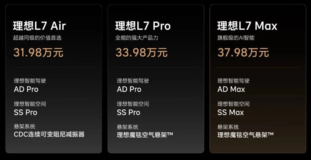 新增的Air版是理想L7的入门版本,进一步拉低产品售价。从配置来看,L7 Air比Pro版取消了大灯高度自适应调节、取消魔毯空气悬架,但CDC减振器仍为标配。同时,Air版本车型采用性价比更高的电池组,电芯品牌为欣旺达和蜂巢能源,性能、质量、保修政策都与Max和Pro版本保持一致。