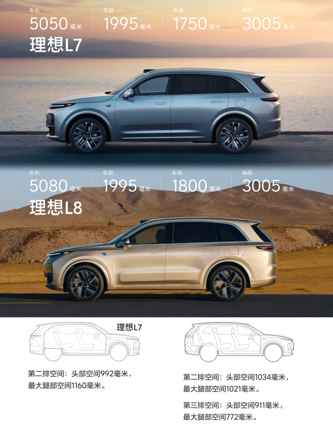 从名字上来看,L7相比L8与L9,总会给人一种“小杯、中杯、大杯”的“错觉”,但实际上这台L7依然是个大家伙,车身长宽高达5050/1995/1750mm,轴距3005mm,与奔驰GLE的尺寸相当。