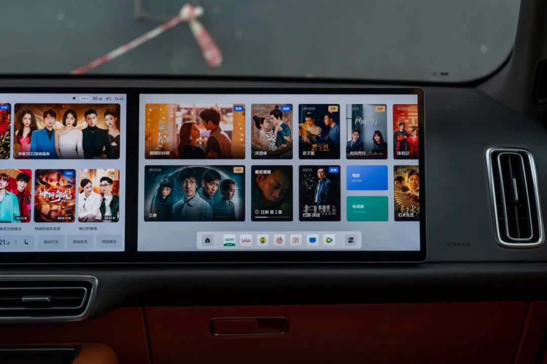 副驾驶娱乐屏支持丰富的娱乐App,例如目前十分火热的电视剧《狂飙》就可以观看。此外,这块大屏还支持投屏功能。同时,也可以单独连接蓝牙耳机,以免打扰到主驾驶与后排乘客。