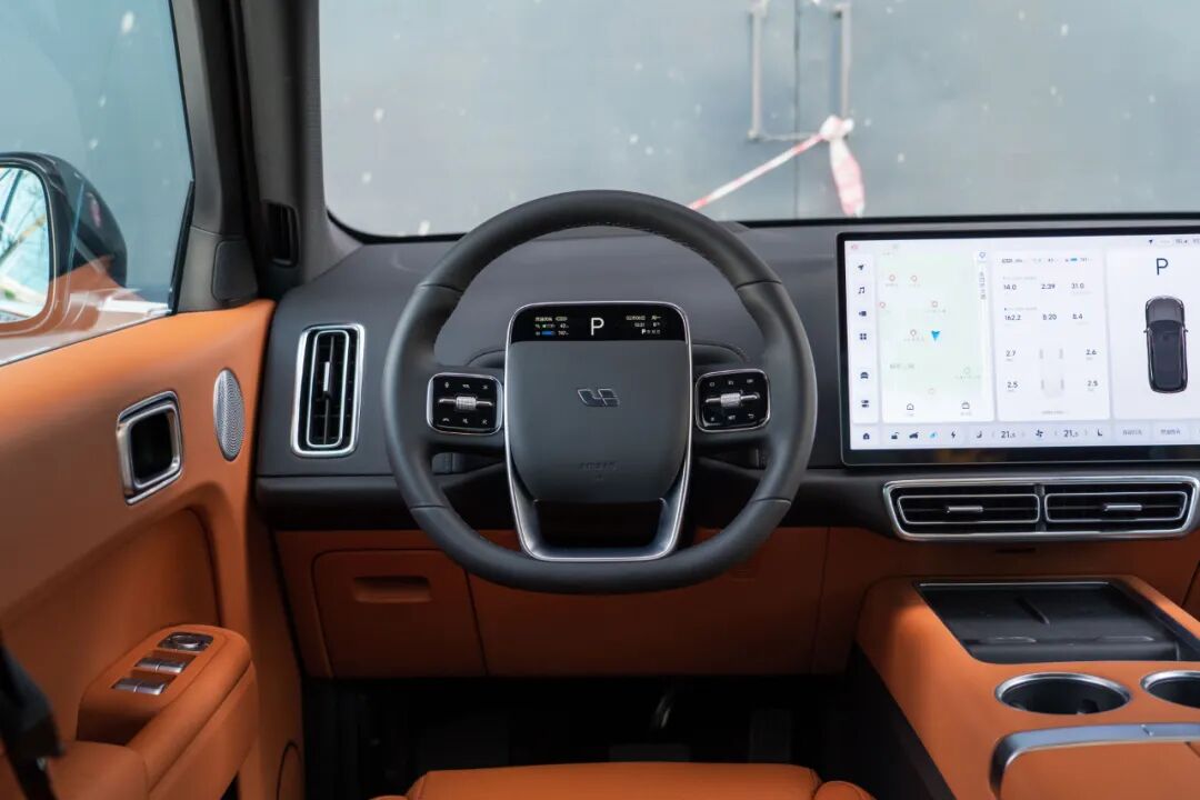 Nappa真皮方向盘的整体尺寸不算大,但粗壮的握环有着饱满的手感。由于没有传统仪表盘,驾驶员获得了十分宽阔的视野,同时方向盘上的交互屏幕可以提供完备的行车信息。