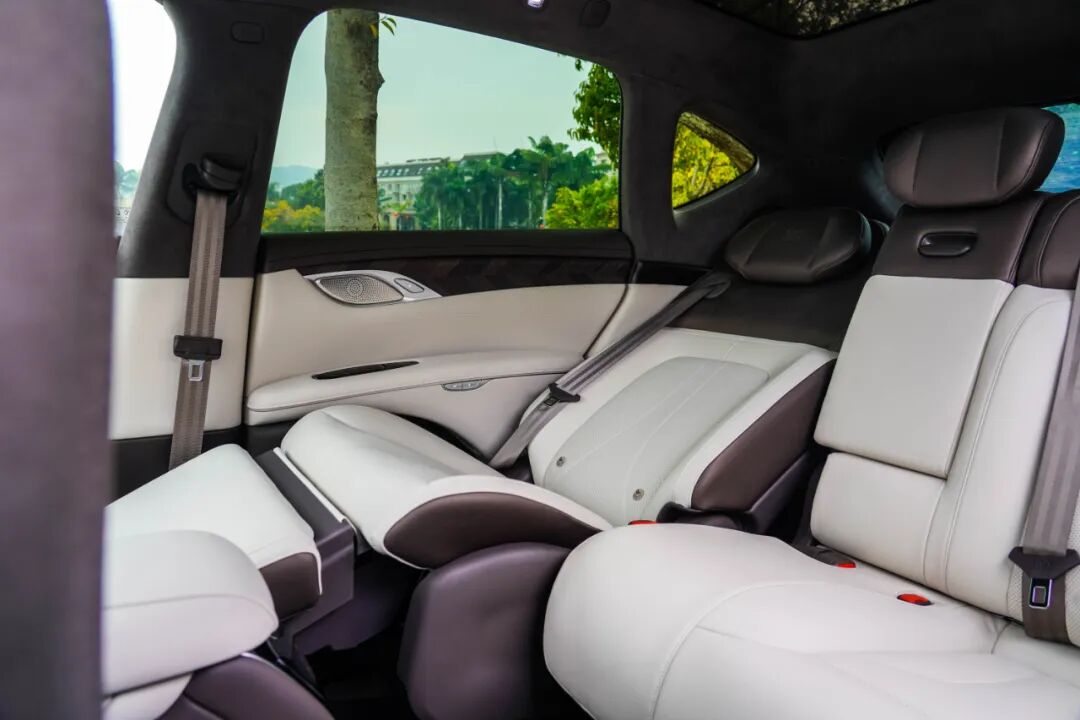 前排座椅功能极为丰富,带可调节腿托且填充物柔软,舒适性给予好评。后排座椅在常规状态下舒适性要优于前排,右侧的独立座椅更不用说,121°的零重力座椅模式和155°的躺平模式也属于这个级别车型舒适的天花板存在了,领先某界M7很多。但有一点不足,座椅电动调节有延迟。