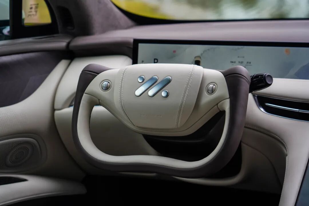 智己LS7配备半幅式方向盘,目前来看还是比较新鲜的物件,对于前方视野和车内的科技感都有很大的提升,只是需要很长的时间去适应,尤其是在调头和泊车时。当然了,厂家也为用户提供了全幅式方向盘可选,不过我认为多数用户还是会将半幅式视为首选。