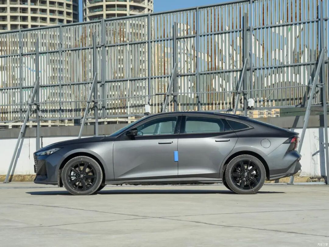 来到车侧,新车拥有流畅的车顶线条,同时,车辆的腰线设计相当犀利,与车顶线条相比有着鲜明的反差感。此外,新车还配备了一款黑色轮圈,营造出更强的攻击性。