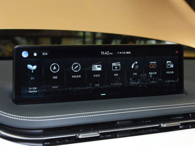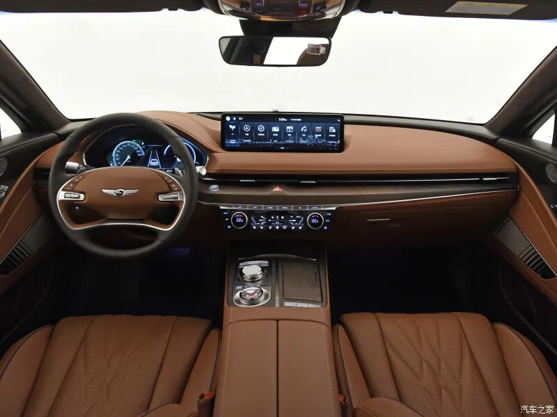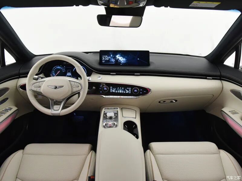相比纯电GV70,这台纯电G80内饰增加了更显平直的线条,空调控制区域也更有棱角。中控台依然是熟悉的环抱式设计,全液晶仪表和中控大屏的界面UI以及集成的功能基本与纯电GV70保持一致,在此不作赘述。