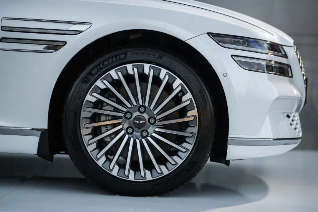 20英寸轮圈在造型和配色层面都具有十足的运动气息,卡钳上的GENESIS标识也有助于提升档次感。轮胎来自米其林,是PILOT SPORT EV系列,这款运动型电动汽车轮胎规格为265/45 R20。