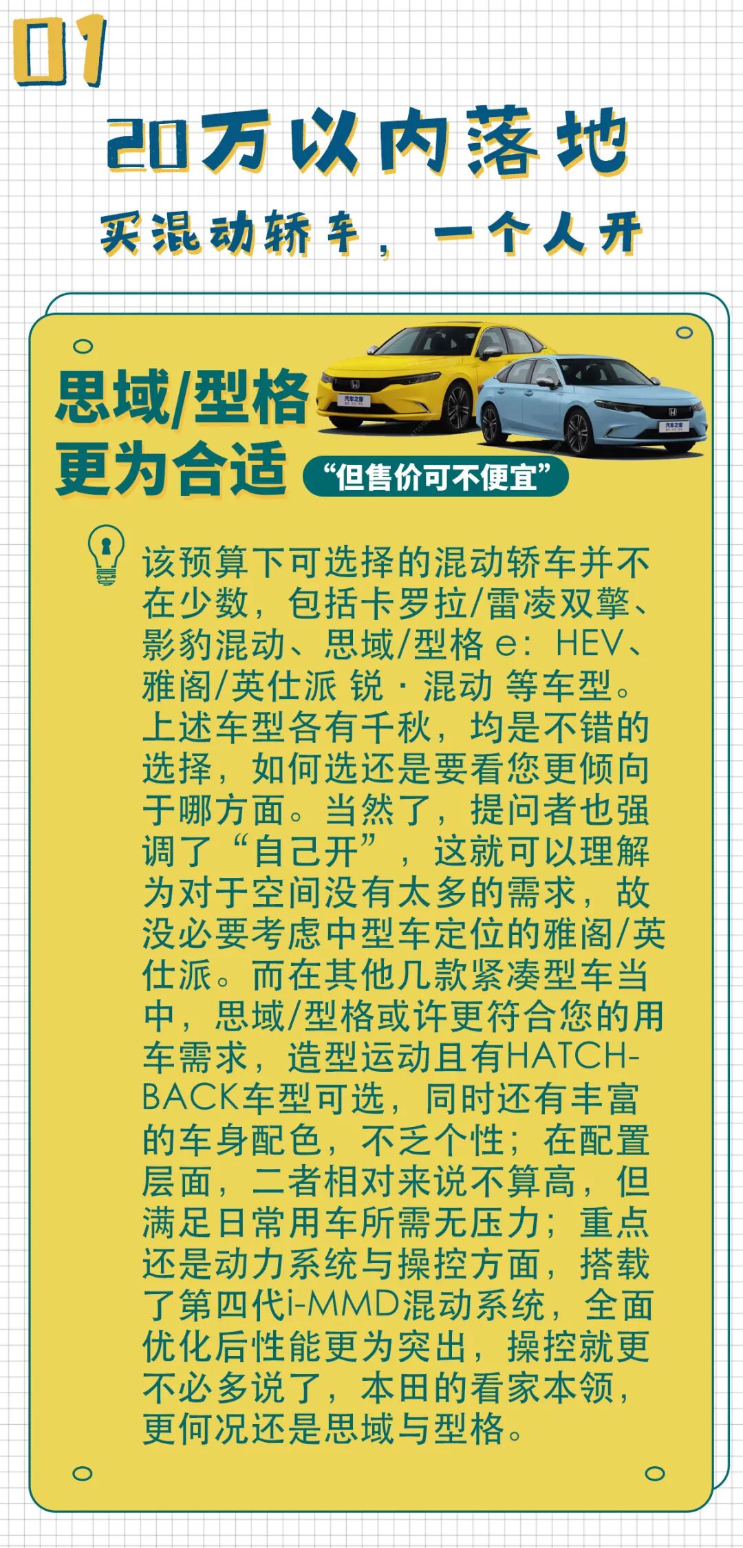 Q1,20万以内落地,买混动轿车,主要是一个人开,有什么推荐?如果长时间内都是自己开的话,笔者建议考虑思域或是型格的混动车型,如果后续有家用需求,那就直接入手英仕派混动车型。