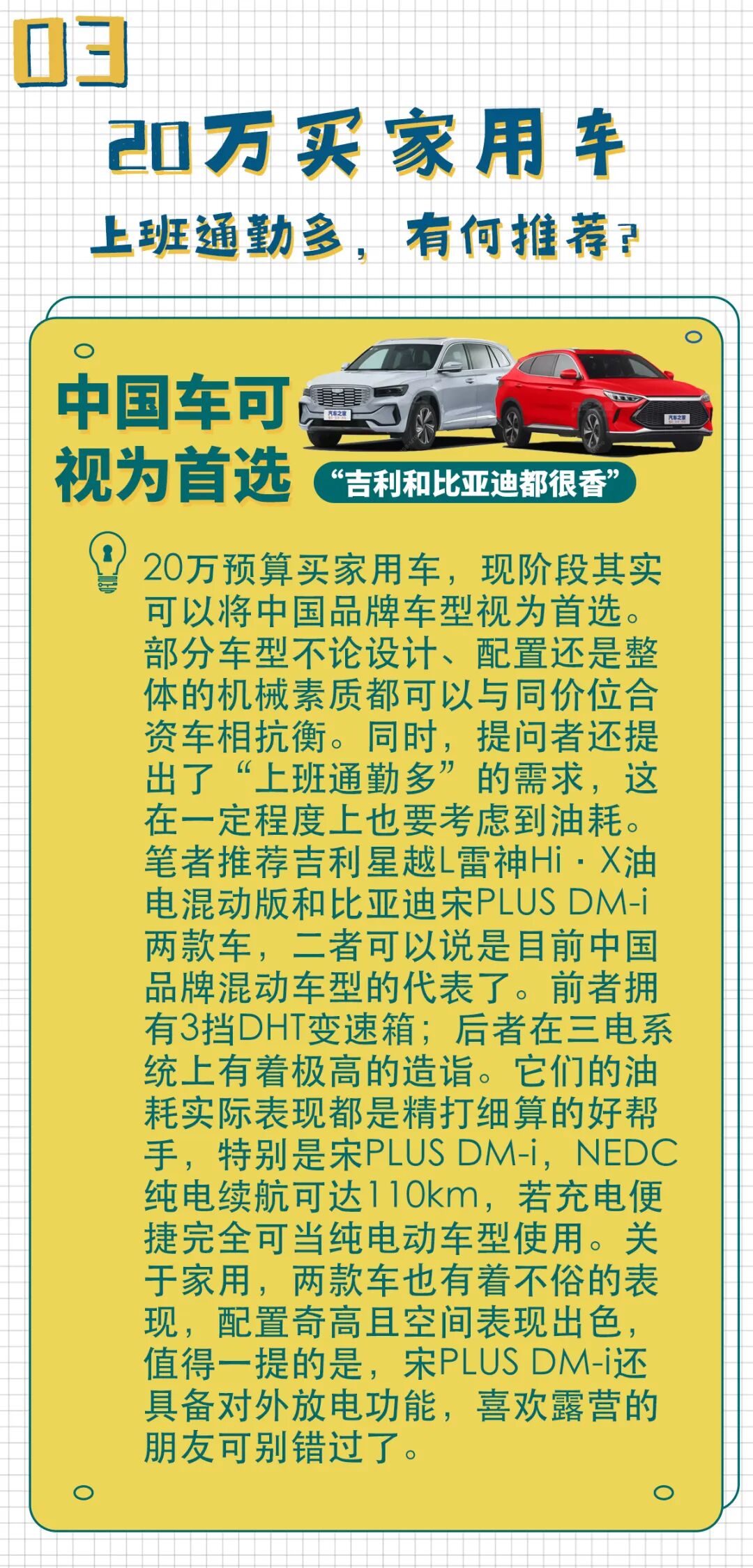 Q3,20万买家用车,上班通勤多,有何推荐?随着中国品牌车企的崛起,现阶段20万的购车预算完全可以将中国品牌车型视为首选,吉利星越L雷神Hi·X油电混动版和比亚迪宋PLUS DM-i都是不错的选择。