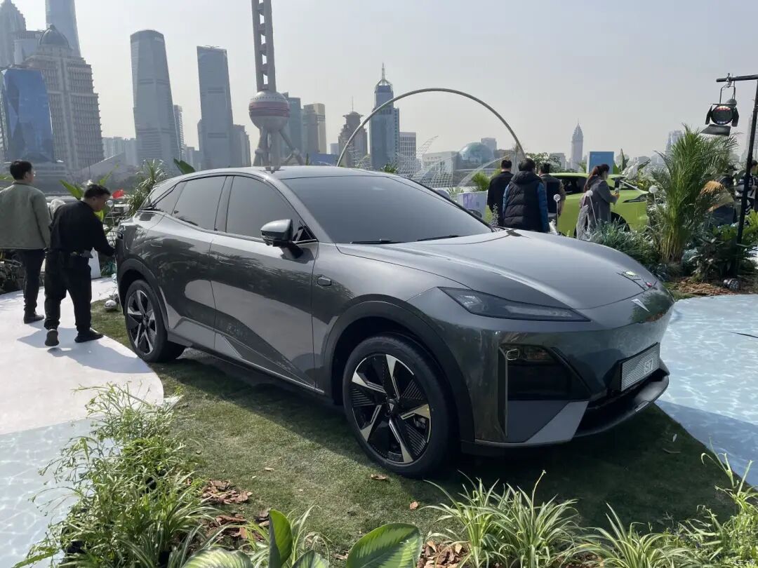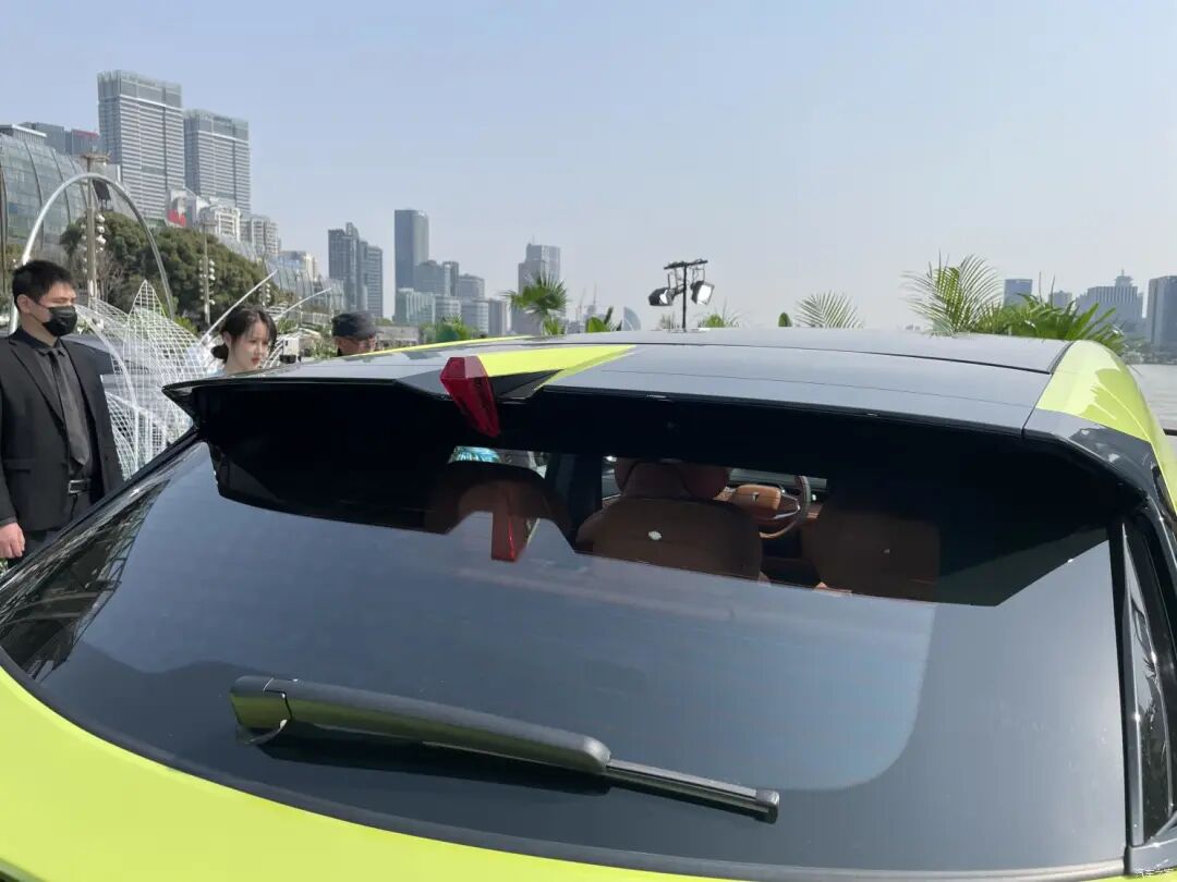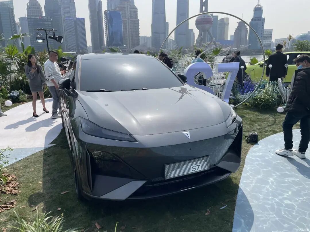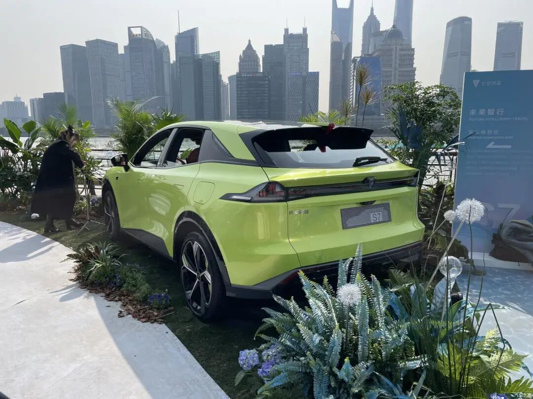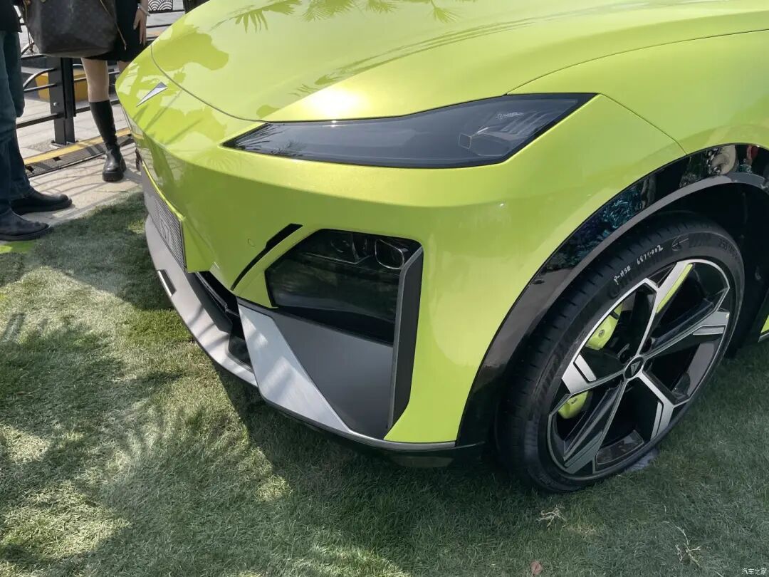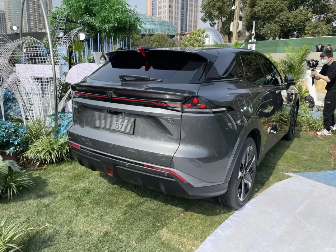 深蓝S7延续了深蓝SL03上的家族式设计风格,棱角分明的前脸极富攻击性。另外,无论是纯电动还是增程式混动版车型,其前脸都采用了封闭式格栅设计。现场展示的荧光黄为纯电车型,灰色为增程混动版本,你能看出两者之间的不同吗?