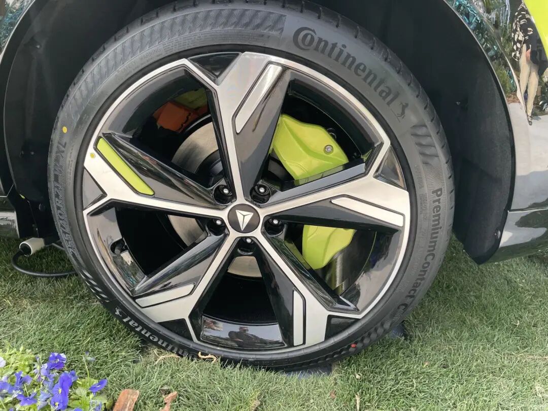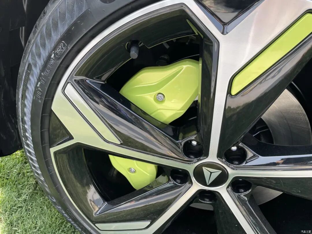 纯电版深蓝S7展车配备了尺寸庞大的21英寸运动轮圈,并搭配马牌旗下主打静音和低滚阻特性的PCC系列轮胎,前后胎规格为255/40 R21。透过轮圈还能看到与车身同色的刹车卡钳,运动气质到位。