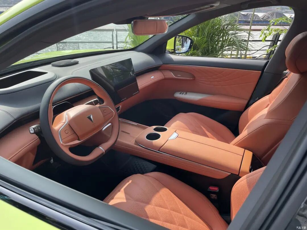 新车内饰造型十分惊艳,该车没有配备传统意义上的仪表屏,而是用大尺寸AR-HUD抬头显示取代。中控屏尺寸同样很大,我们预计其内部系统采用与深蓝SL03相同的深蓝智能座舱系统,并内置高通骁龙8155处理器。