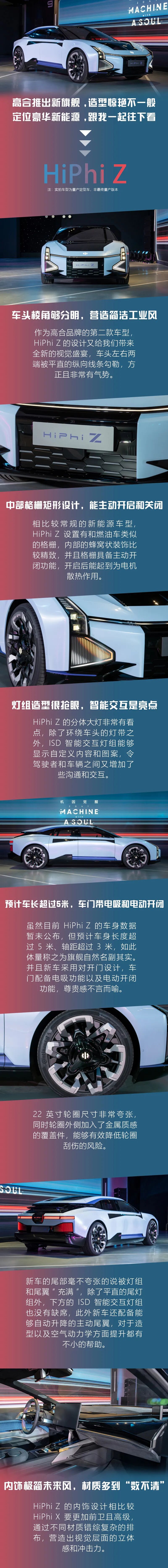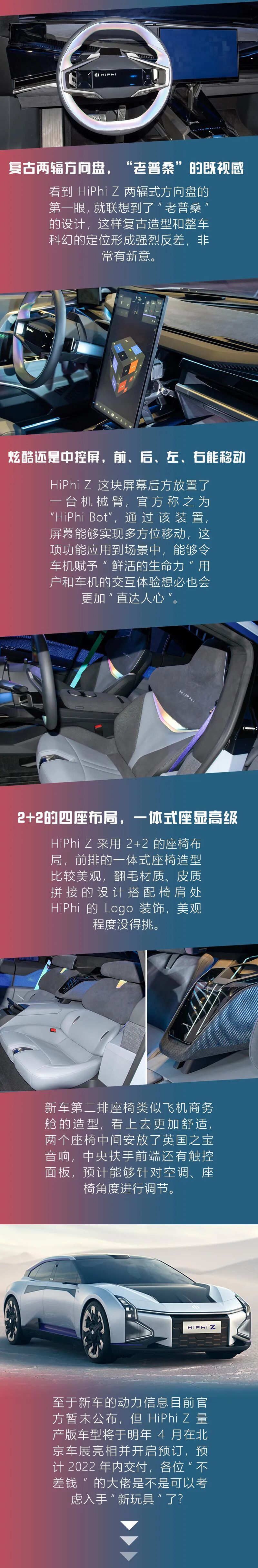 电动对开门、带机械臂的中控大屏,单单这两个亮点就已经足够“把玩”了,何况HiPhi Z的造型设计带有浓郁的未来科技风格,此外新车后排的双独立座椅更是看点十足,类似飞机商务舱的造型配合丰富的舒适、便利配置,在豪华氛围的营造上也是没得挑。虽然我们实拍车型并非最终量产版本,但官方表示量产版本车型将会有95%和实拍车型相同。HiPhi Z将会在明年4月开启预售,并且在2022年交付,所以你准备好迎接“未来科幻座驾”了吗?