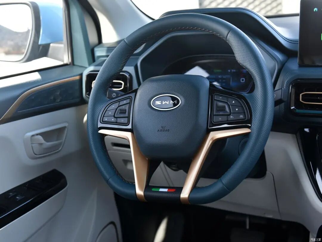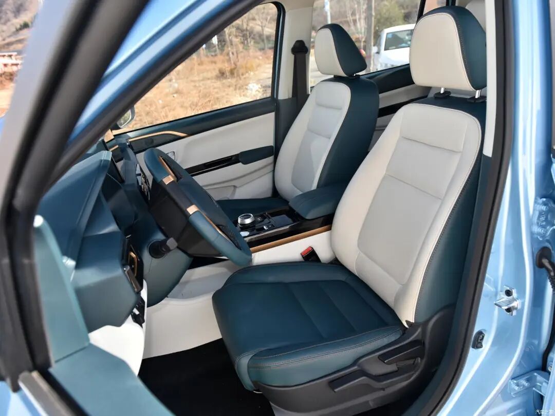 内饰采用清新淡雅的蓝白双色进行搭配,并加入了更具质感的金色材质勾勒,对于高级感的营造较为到位。在用料方面,中控台采用大面积的硬质塑料,对于这个价位的车型而言,也还是能够接受的。