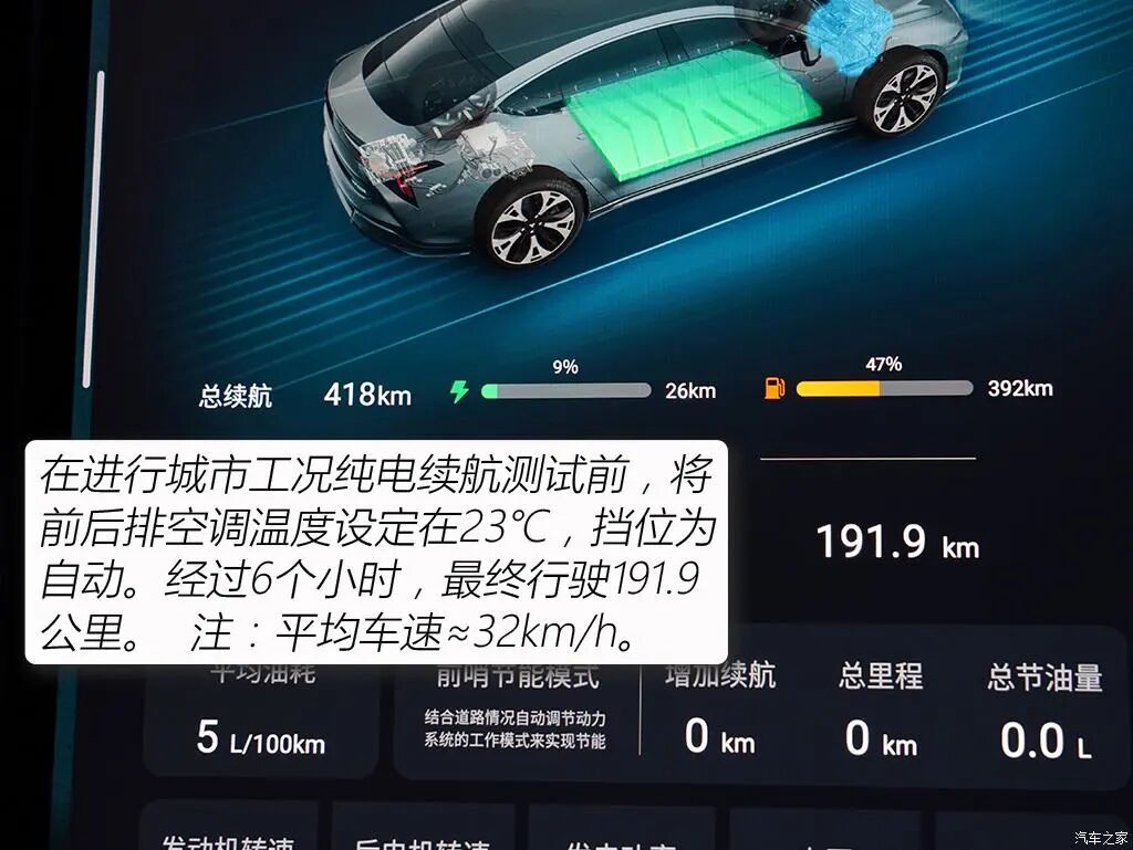 我们首先对哪吒S增程版进行了城市道路纯电能耗测试,测试时的车外温度为-2℃,将车辆电池电量充满,驾驶模式调至极致纯电,车内空调温度设定在23℃,挡位为自动。在整个测试过程中,车辆优先使用纯电驱动,当电池SOC到达9%时,增程器启动,纯电续航测试结束;在增程器启动之前,哪吒S增程版依靠纯电力行驶了191.9公里。