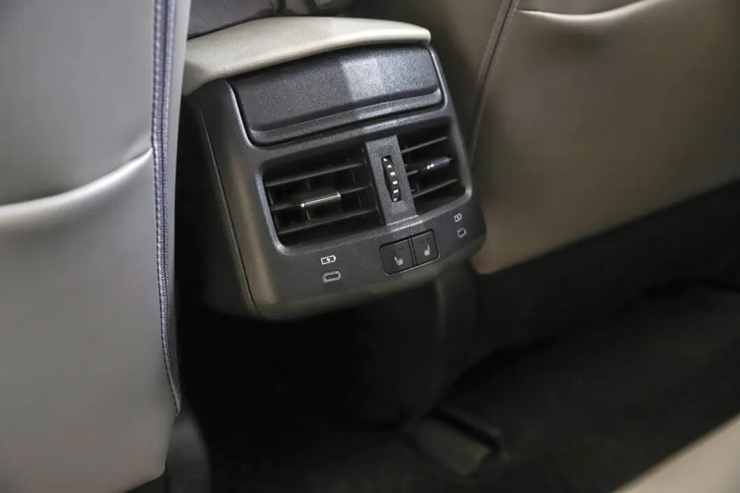 后排座椅填充非常柔软,坐上去有明显的下陷感,宛如沙发一般,只是座垫长度较短。座垫采用直通一体式设计,并且前方出风口下方进行了掏空处理以方便中间乘客放脚,如此设置契合“FAMILY LOUNGE合家欢”的开发理念。不过事物总是会有两面性,中间乘客更舒适的乘坐感受是以牺牲中央扶手箱为代价的。