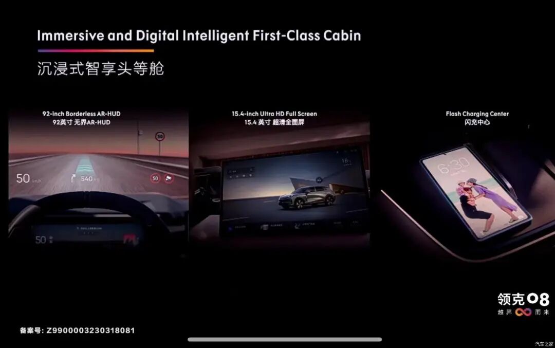 内饰来看,领克08的整体设计更加凸显简洁的造型感。巨幅悬浮岛是中控部分的设计核心,领克08还配备了92英寸AR-HUD,配合12.3英寸全液晶仪表,增强了驾驶者的交互体验。15.4英寸中控屏幕拥有超窄边框,其内部将搭载Flyme Auto魅族车机系统。