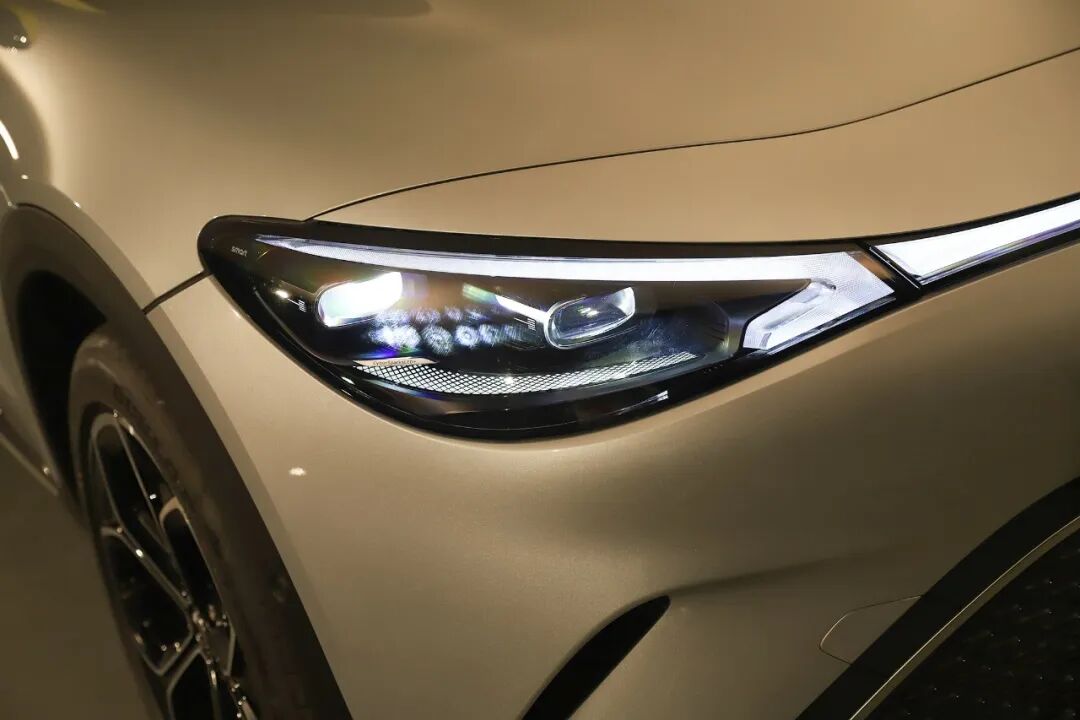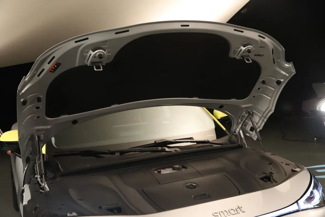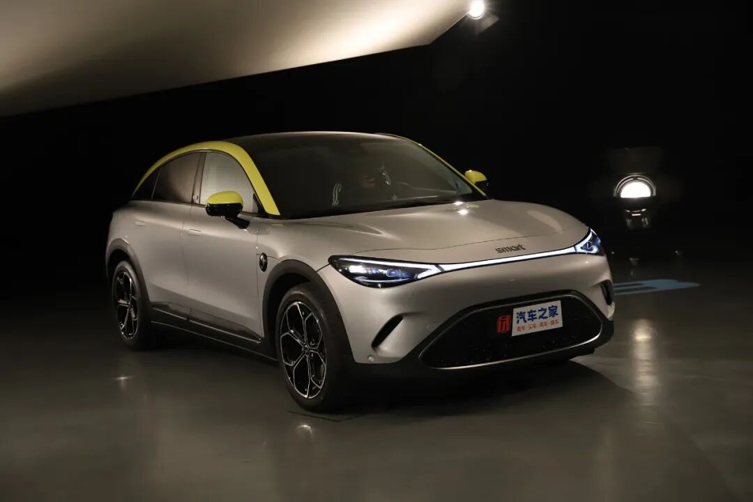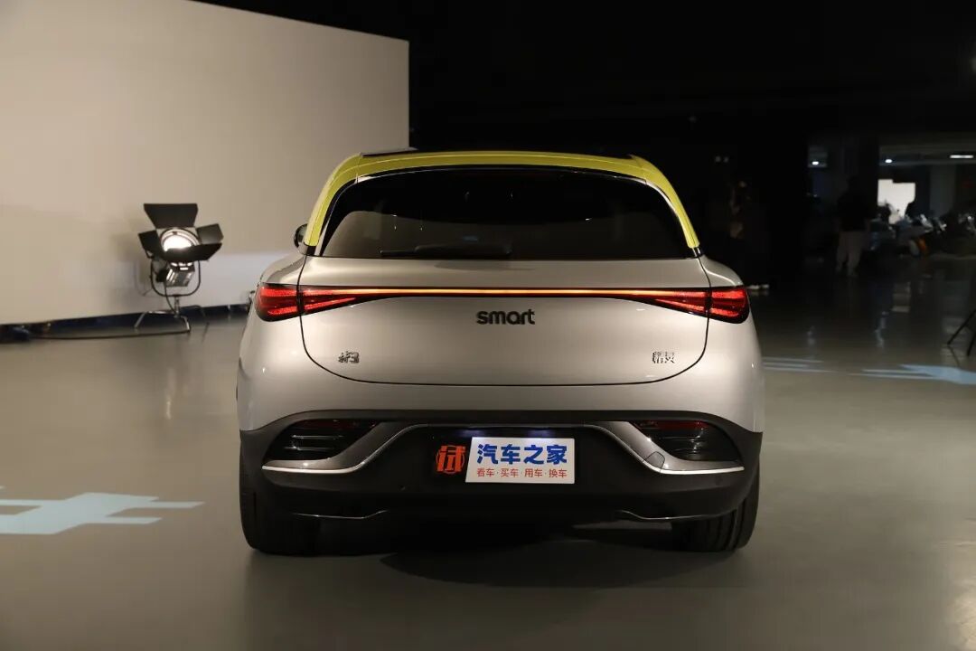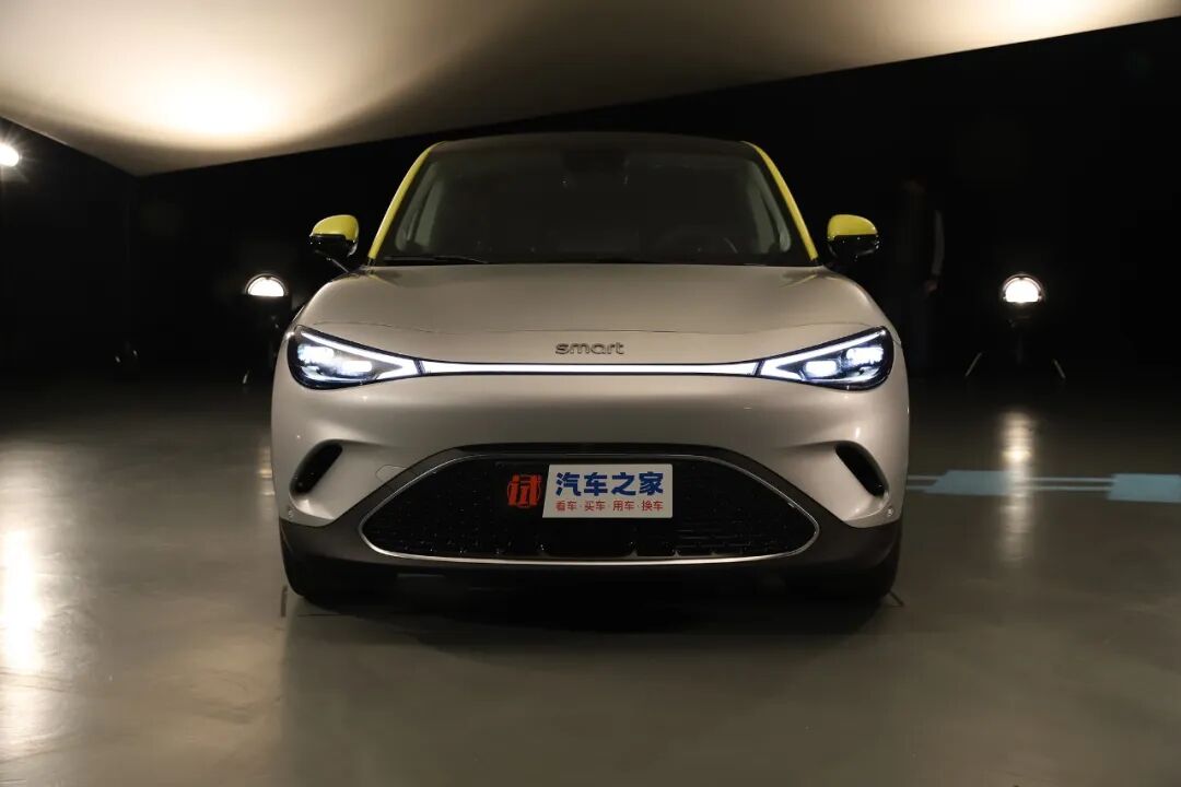 新车前脸有鲜明的家族特征,横贯左右的LED灯带承托着smart品牌标识,头灯内部构造也可以用精致来形容。近似“鲨鱼鼻”造型的A字型宽阔格栅采用黑色涂装,配合两侧的导风口进一步提升了运动感。