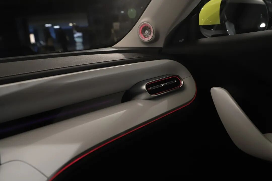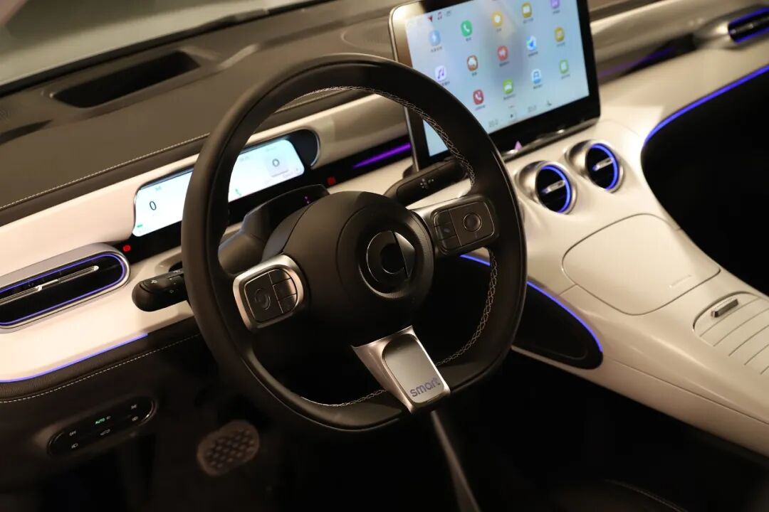 smart精灵#3内饰同样采用家族设计,黑白两种颜色搭配可以营造出层次感和时尚感,中间三个圆形空调出风口有点AMG GT的感觉。氛围灯绝对是车内的点睛之笔,灯带可以勾勒出中控台轮廓,也能藏身于空调出风口,还可为Beats音响系统作配,前卫摩登气息被精准拿捏。