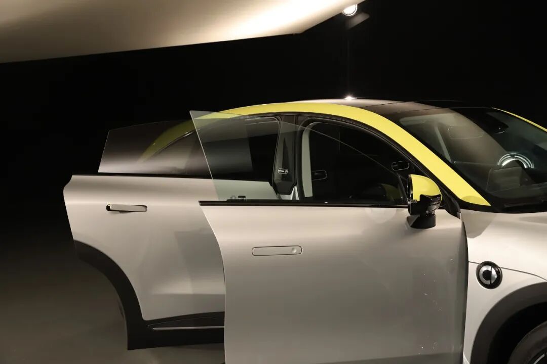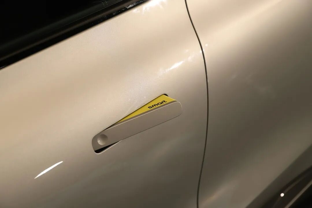 B柱的三叉星徽标识表明了这款产品是由奔驰主导设计,隐藏式门把手有助于降低风阻,隐藏部位的流明黄涂装以及smart标识展现出细节方面的设计感。