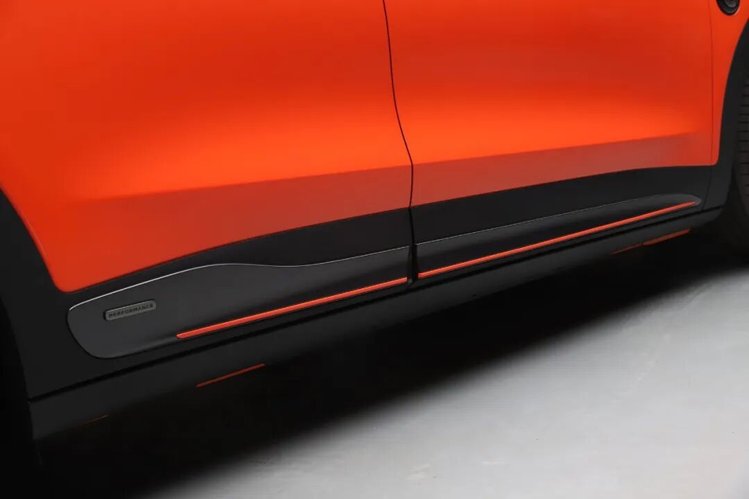 侧面变化主要集中在配色层面,卡钳采用红色涂装,外后视镜被黑化而且侧裙加入了带有PERFORMANCE标识的装饰元素。