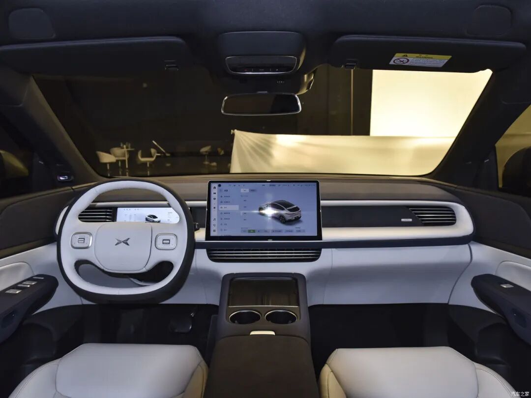 小鹏G6内饰采用矢量星环设计语言,整体呈现出简约的风格,中控台造型平直同时空调出风口也采用平直元素点缀,对延展视觉宽度大有裨益。双辐式方向盘采用与中控台相呼应的配色,更显品质感。