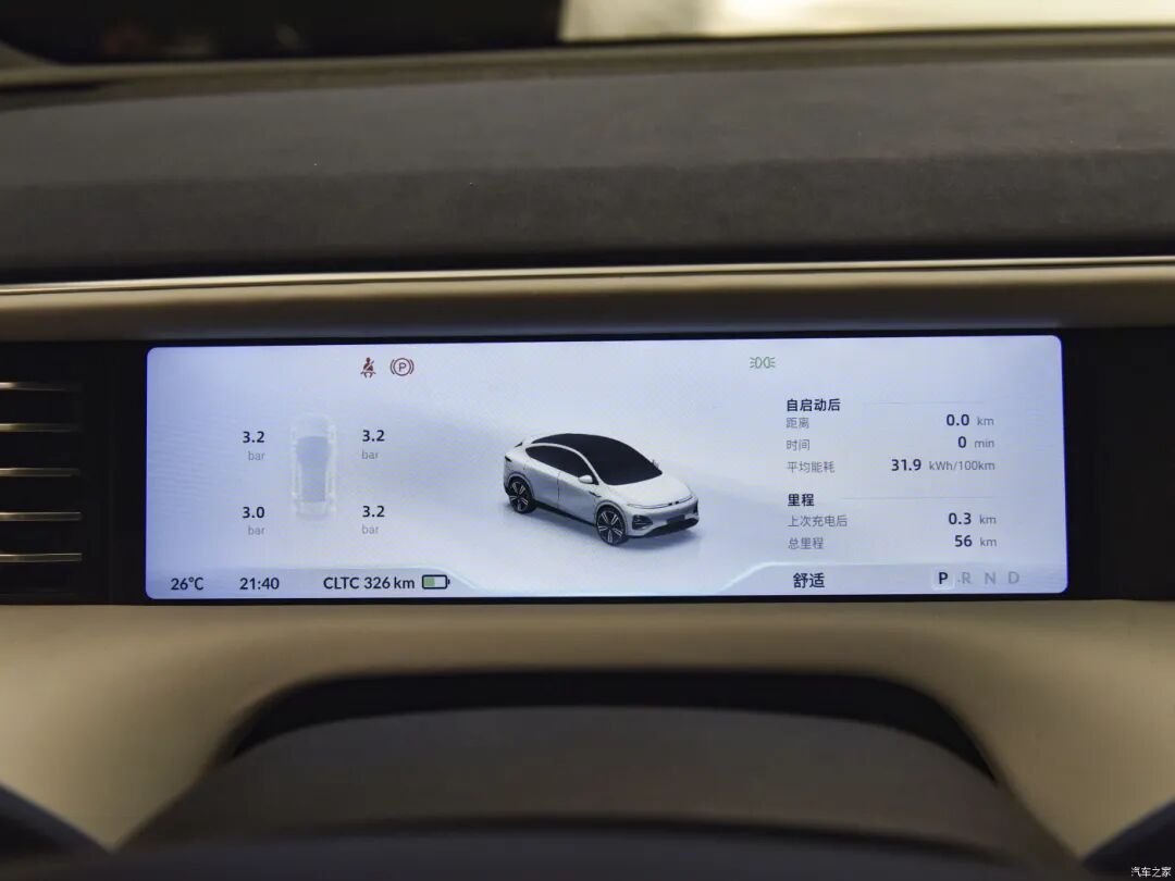 全液晶仪表造型比较狭长,轮胎压力、续航里程、驾驶模式等信息都可显示并且显示效果不错。