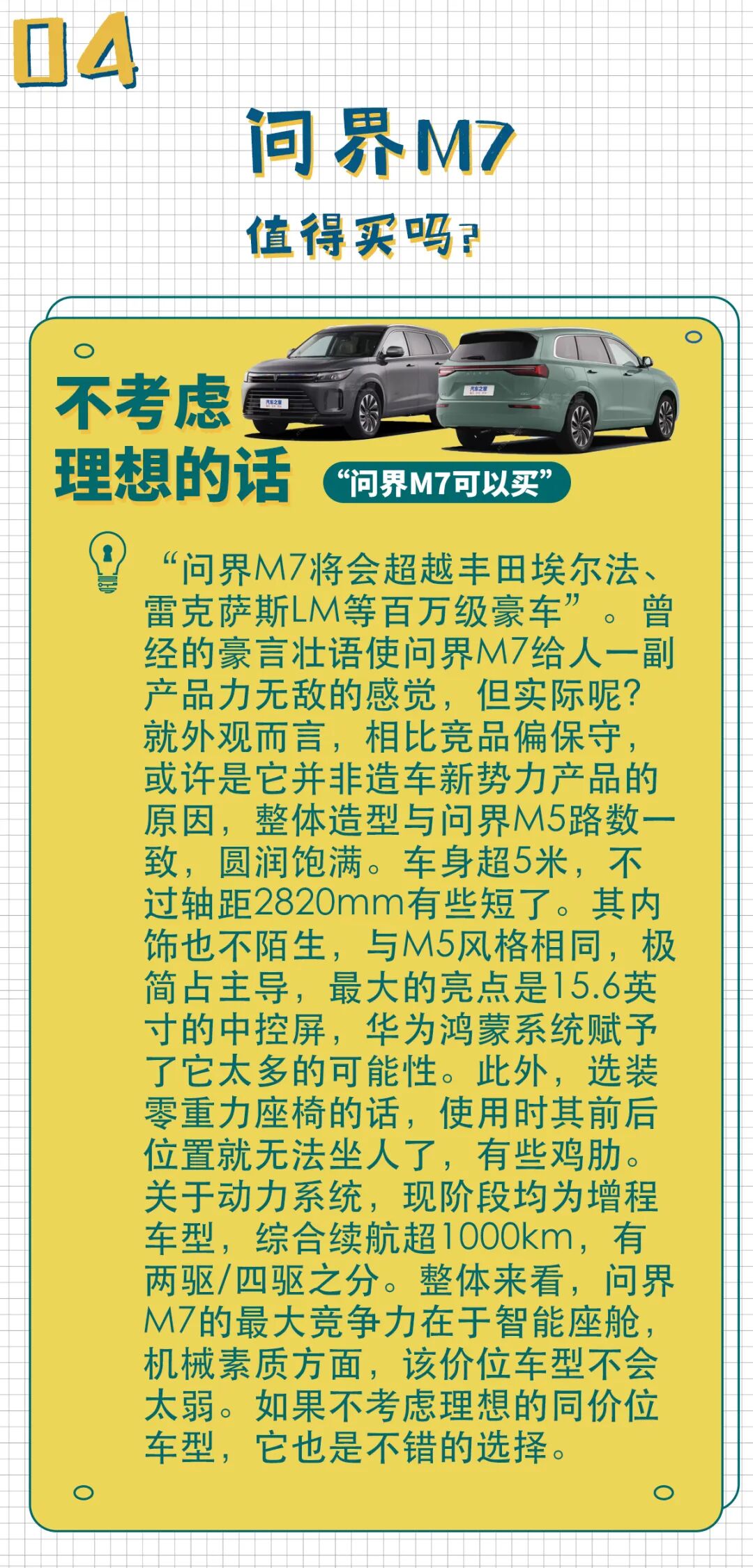 Q4,问界M7值得买吗?如果您追求极致的智能座舱,那么问界M7是不二之选,否则买同价位其他车型也不错。