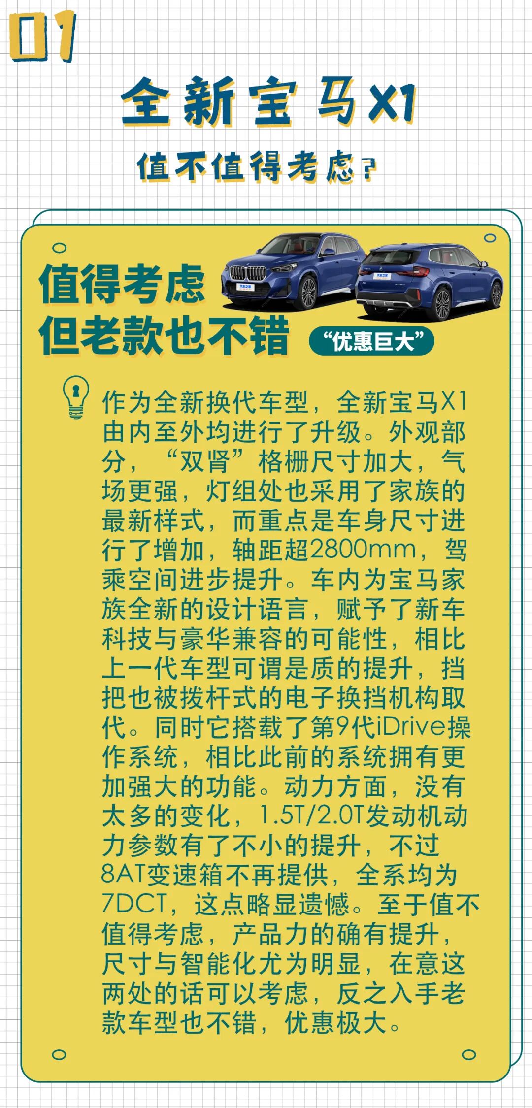Q1,全新宝马X1值不值得考虑?新车最大的提升在于外观、尺寸以及智能化方面,动力系统阉割了8AT变速箱着实有些让人难以接受。如果您在意它所提升的点,那就值得入手。此外,老款车型现在优惠力度极大,更值得入手。