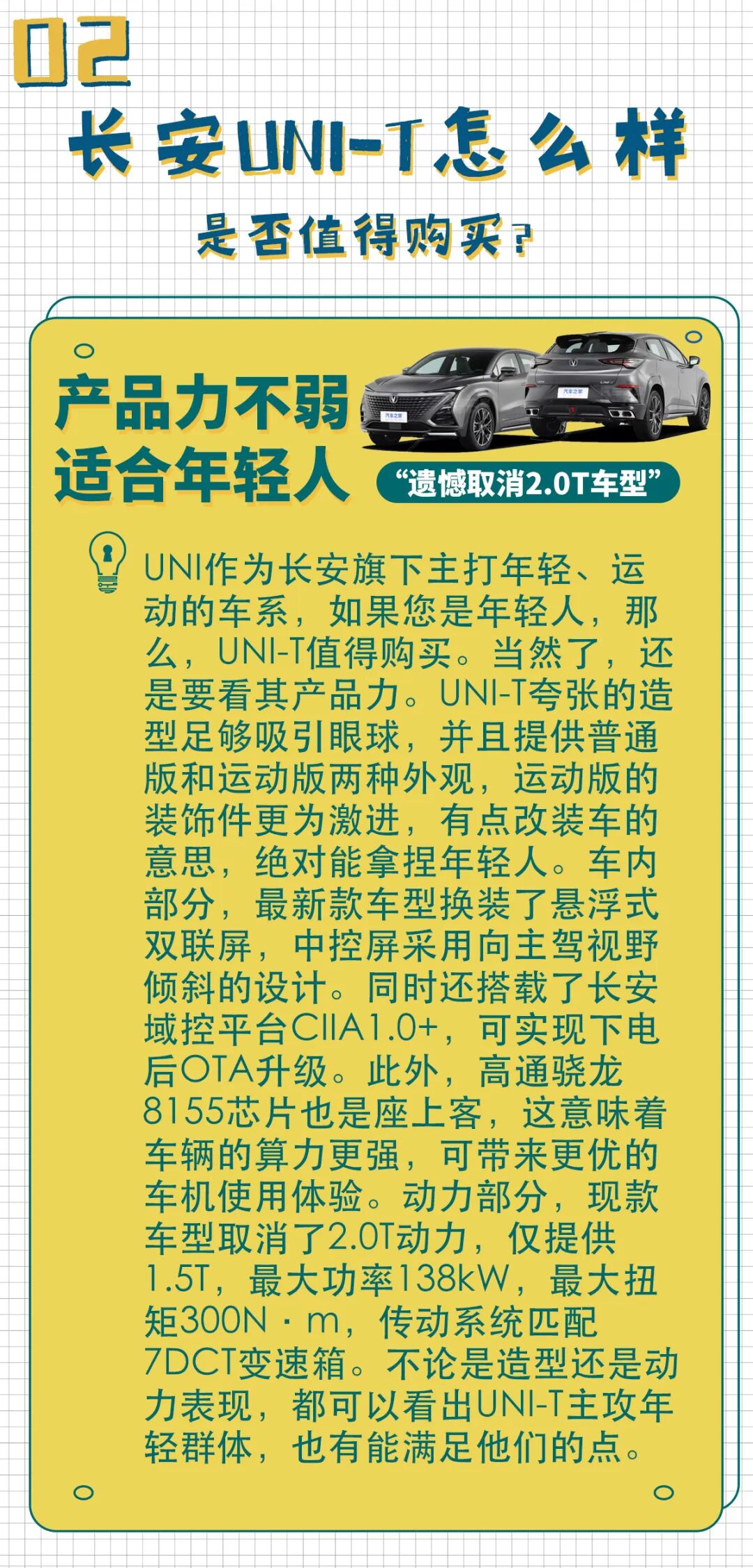 Q2,长安UNI-T怎么样?是否值得购买?车没问题,综合实力够出色。是否值得买,还是要看您的需求,若您是年轻人,它的表现恰巧能正中下怀。
