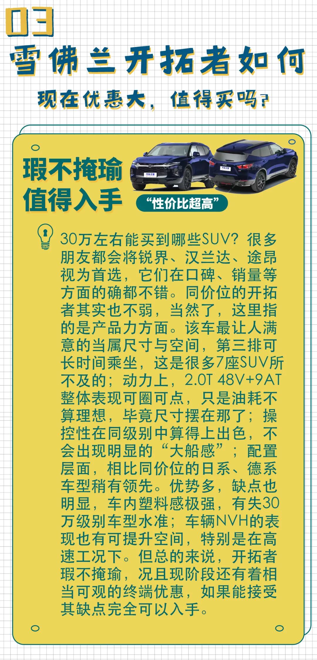 Q3,雪佛兰开拓者如何?现在优惠大,值得买吗?30万买合资中大型SUV,又有着大空间、高配置、强动力,非常具有性价比了,再加之现阶段的可观优惠(北京地区6万左右,上海地区7.5万左右),直接冲就行了!