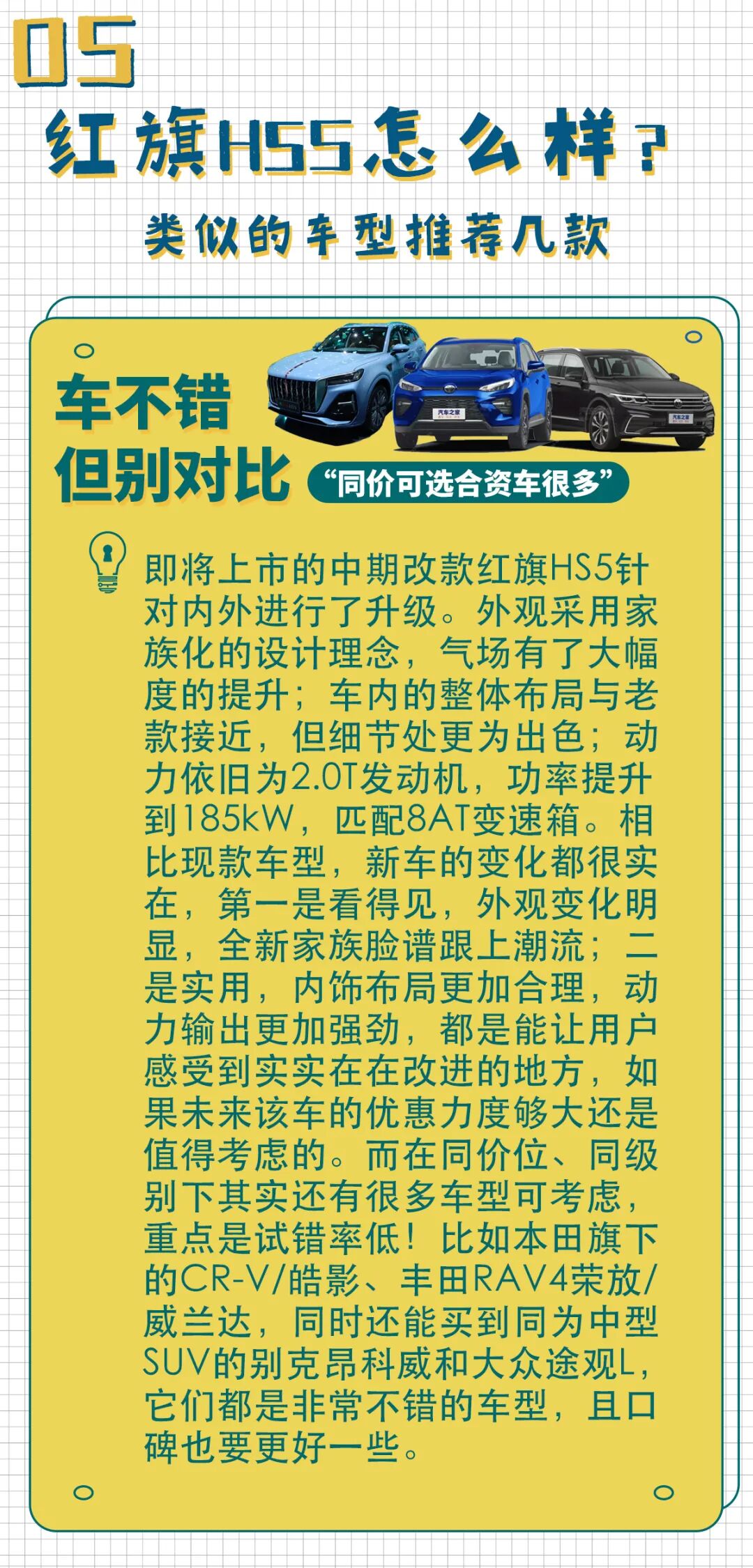 Q5,红旗HS5怎么样?类似的车型推荐几款。红旗HS5总的来说中规中矩,可以入手,但前提是对该品牌情有独钟。同价位、同级别合资车不在少数,且都是不错的选择。