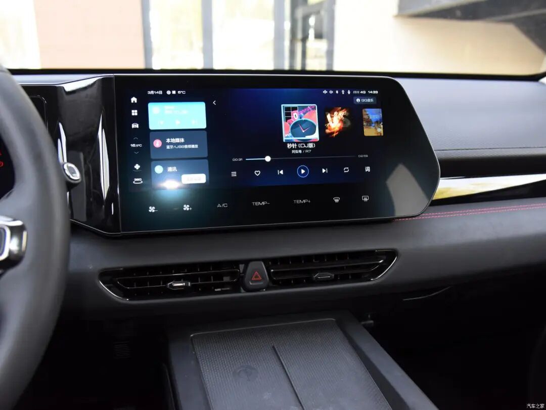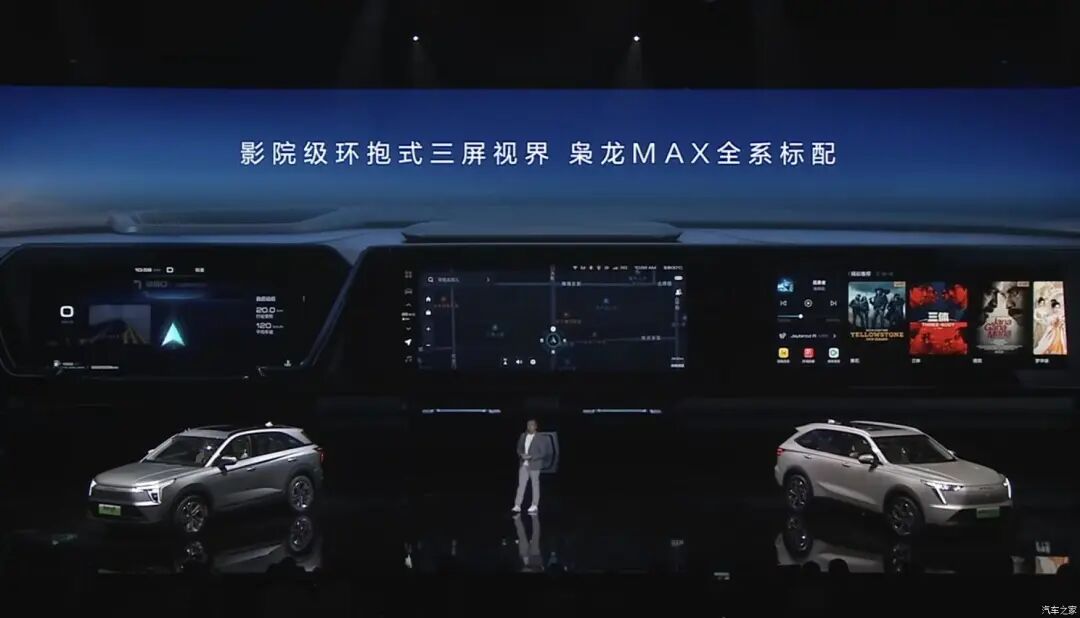 枭龙MAX内饰采用三连屏设计,中控屏尺寸为12.3英寸(三款屏幕尺寸相同),其中副驾驶屏幕专攻娱乐,可以独立连接蓝牙耳机,整体的豪华感更强一些,配置也更丰富,其将会配备全新一代Coffee OS系统,搭载骁龙8155芯片。