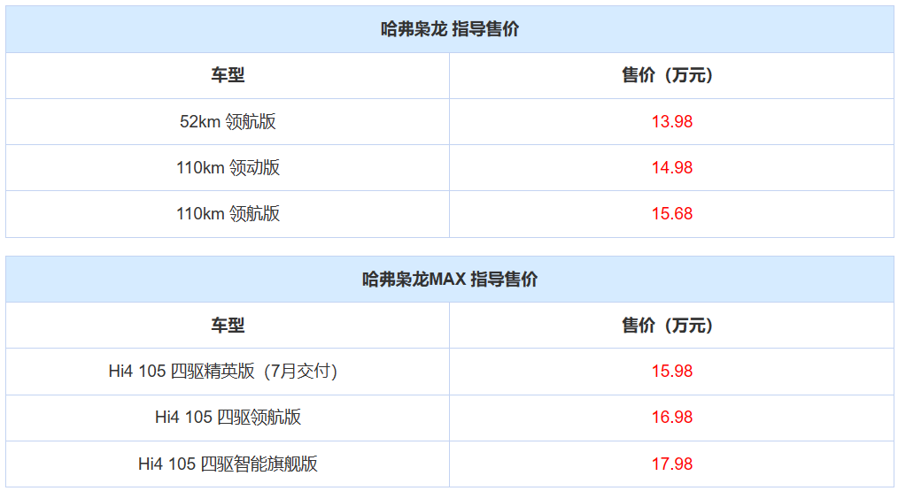 5月15日,哈弗枭龙/枭龙MAX正式上市,哈弗枭龙定位紧凑型SUV,共推出3款配置车型,售价区间为13.98-15.68万元;枭龙MAX定位中型SUV,共推出3款配置车型,售价区间为15.98-17.98万元,其将成为搭载长城全新混动架构Hi4智能电混四驱系统的首款车型。2023年6月30日24时前下订并开票享2000抵4000现金膨胀礼。详细车型售价请见下表: