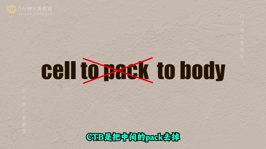 to pack,电芯到包,这个包指的就是电池包,意思是电芯打包成电池包,然后电池包再放到车身上,cell to
