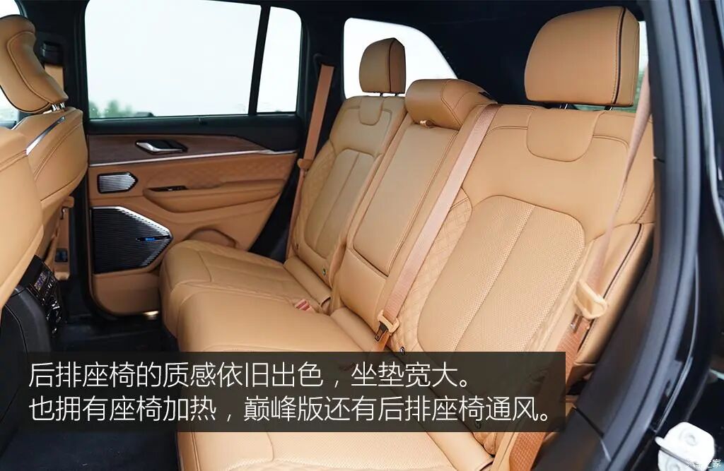 全新大切诺基4xe的后排同样豪华舒适,座椅质感出色,坐垫宽大。然后后排提供座椅加热,巅峰版还有通风,这份舒适乘客会很满意。空调方面,远峰版为双区域空调,巅峰版为四区域空调。