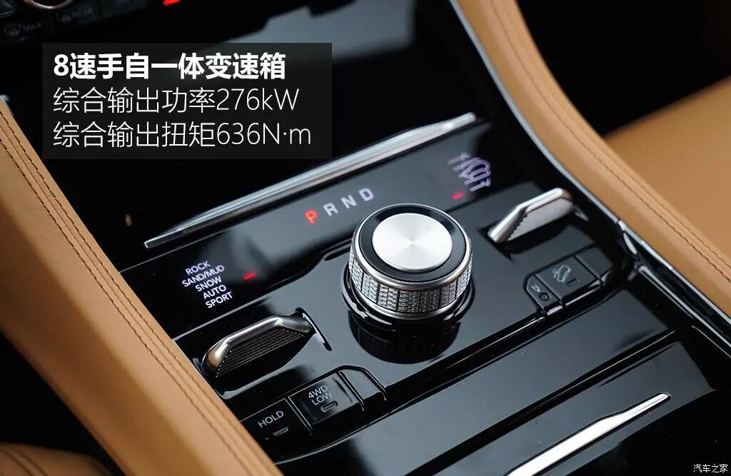 全新大切诺基4xe由一台2.0T发动机加电机组成的插混系统,采用P2混动结构,变速箱为8速手自一体变速箱,相对简单的结构更加可靠,更适合越野需求,当然也可在纯电模式下进行越野。参数方面,2.0T I4 DOHC直喷增压发动机,最大功率200kW,最大扭矩407N·m。电机总功率133kW,总扭矩303N·m。综合输出功率276kW,综合输出扭矩637N·m。