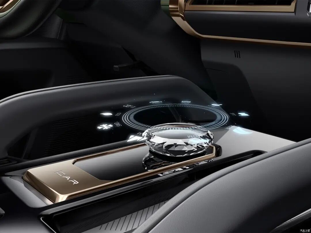 内饰整体以硬朗的线条造型为主,中控台整体采用方形的设计语言,以平直的线条作为区分,搭配金色金属装饰件予以点缀,营造座舱内的科技质感。座舱布局整体对称,悬浮式中控屏以及中控台下方贯通式的设计,扩大内部储存空间,便于日常用品的储存与随手拿取。iCAR 03采用了三幅式方向盘,简化了按钮的设计,配合滚轮进行功能操作。