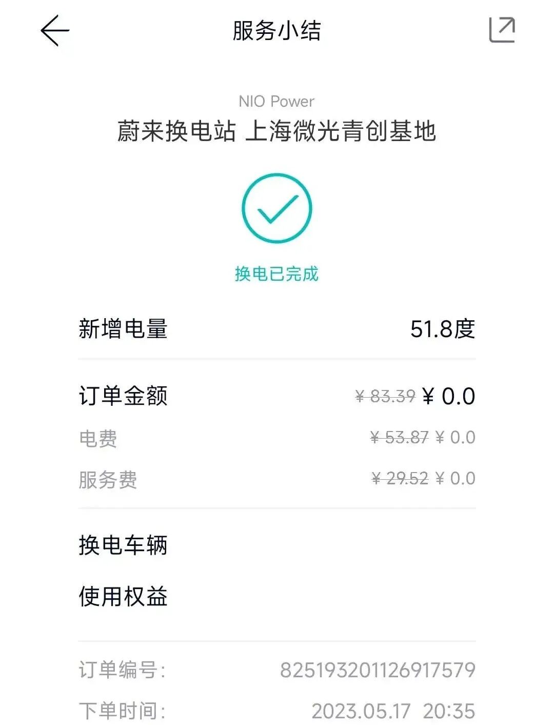 换电是蔚来的业务亮点,可以快速完成补能,让车主有跟加油一样的效率。而收费方面,其实蔚来的换电是按照电费来进行收取,以之前操作过的上海换电为例,换电增加了51.8度电,费用是83.39元(该车有终身免费换电权益),折合每度电1.62元。也就是说,如果你没有免费换电的权益,就需要每次以这个价格乘以换电的量来收费。