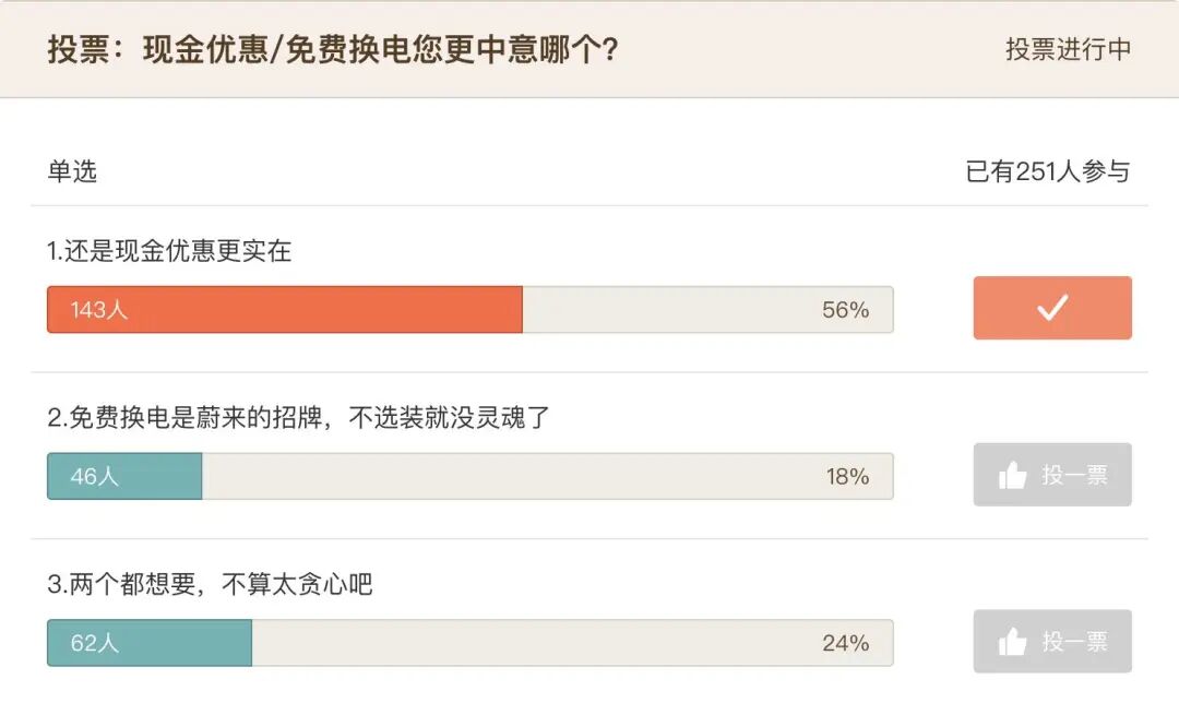 从我们早上发布的投票来看,有56%的人选了省3万,看来大部分用户还是更想看见真切的优惠,毕竟省了钱,后面是自己充电还是换电都会更灵活,更随性,如果是我的话,我会选择省3万,毕竟买电动车的,基本上都会有稳定且价格实惠的充电桩。另外我也采访了一位蔚来老车主,有无限次免费换电服务,他家周围刚好有换电站,他觉得即使后面换车,也会保持现在的无限次免费换电服务,因为用习惯了且效率很高。所以3万元还是免费换电,真的需要考虑到自身的实际情况来定。