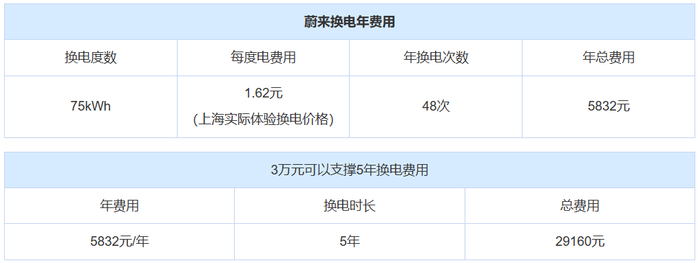 这种情况下,每周换电用去的费用,简单计算就是75kWhX1.62元(上海实际体验换电价格)X4次X12个月=5832元,3万元可以支撑5.14年的换电费用。如果是100kWh版本,那么不需要5年就可以用完3万元的成本。