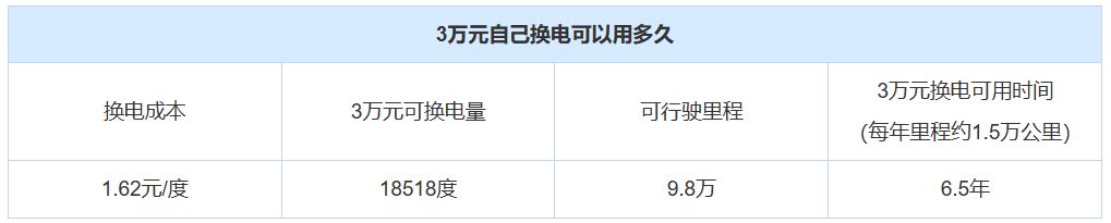以换电成本每度电1.62元计算(上海实际体验换电价格),3万元大概可以换18518度电,如果简单估算一下,75kWh的电池实际行驶里程400公里,电耗为18.75kW/100公里,3万元共可以换9.8万公里的续航电量。如果不是每周都能跑干一块电池,以平均每年1.5万公里计算,约可以换电6.5年。