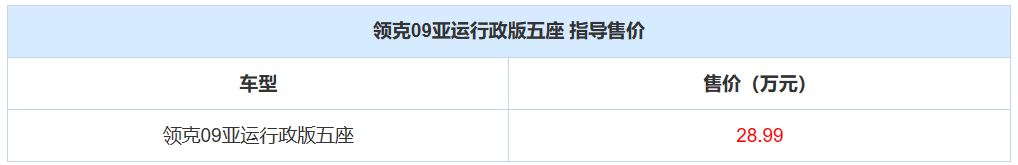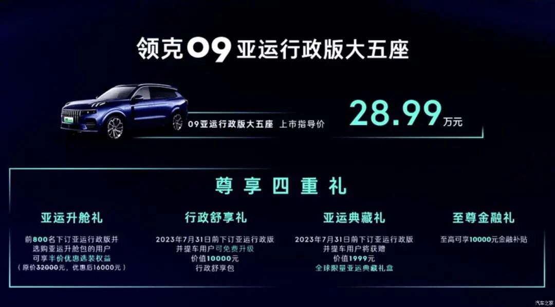 6月15日,领克09亚运行政版五座正式上市,新车搭载2.0T插电式混动系统,车内采用五座设计,同时拥有更大的后备厢空间,其售价为28.99万元。